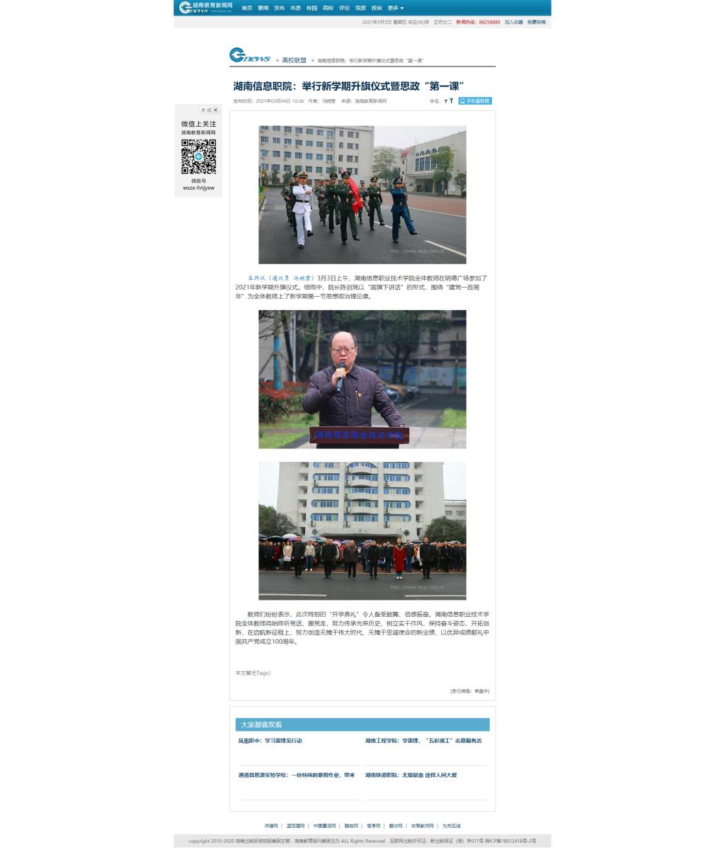 3月4日,湖南教育新闻网发布《湖南信息职院:举行新学期升旗仪式暨思政“第一课”》。