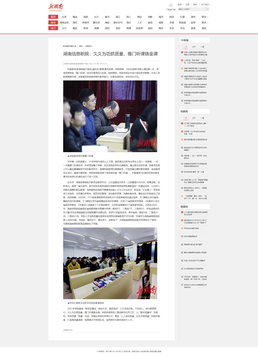 3月8日,新湖南发布《湖南信息职院:久久为功抓质量,推门听课铸金课》。
