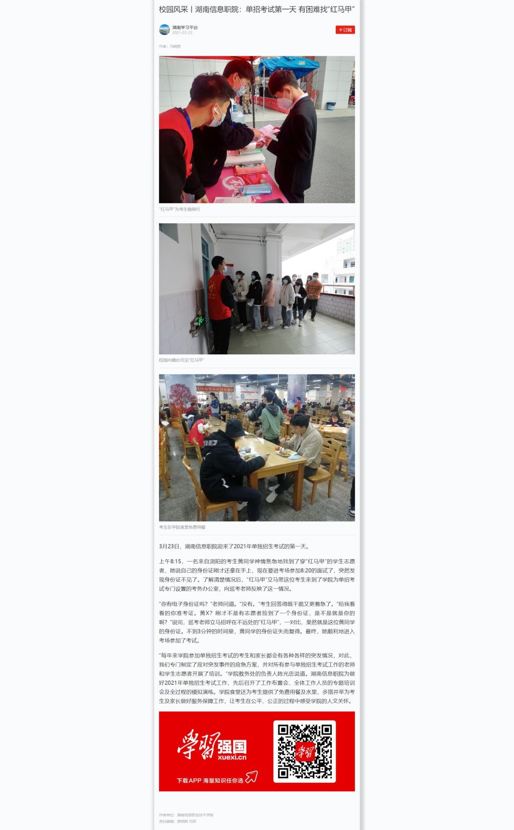 3月23日,学习强国发布《校园风采丨湖南信息职院:单招考试第一天 有困难找“红马甲”》。