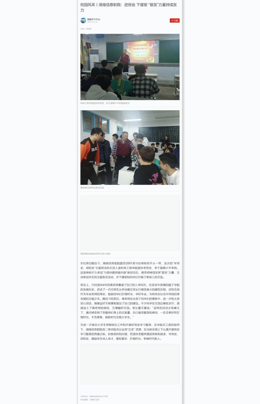 3月30日,学习强国发布《校园风采丨湖南信息职院:进班会 下寝室 “银发”力量持续发力》。