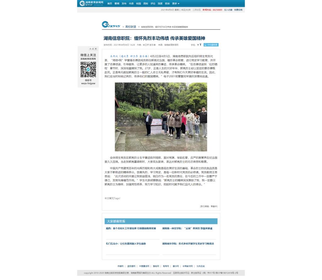4月6日,湖南教育新闻网发布《湖南信息职院:缅怀先烈丰功伟绩 传承英雄爱国精神》