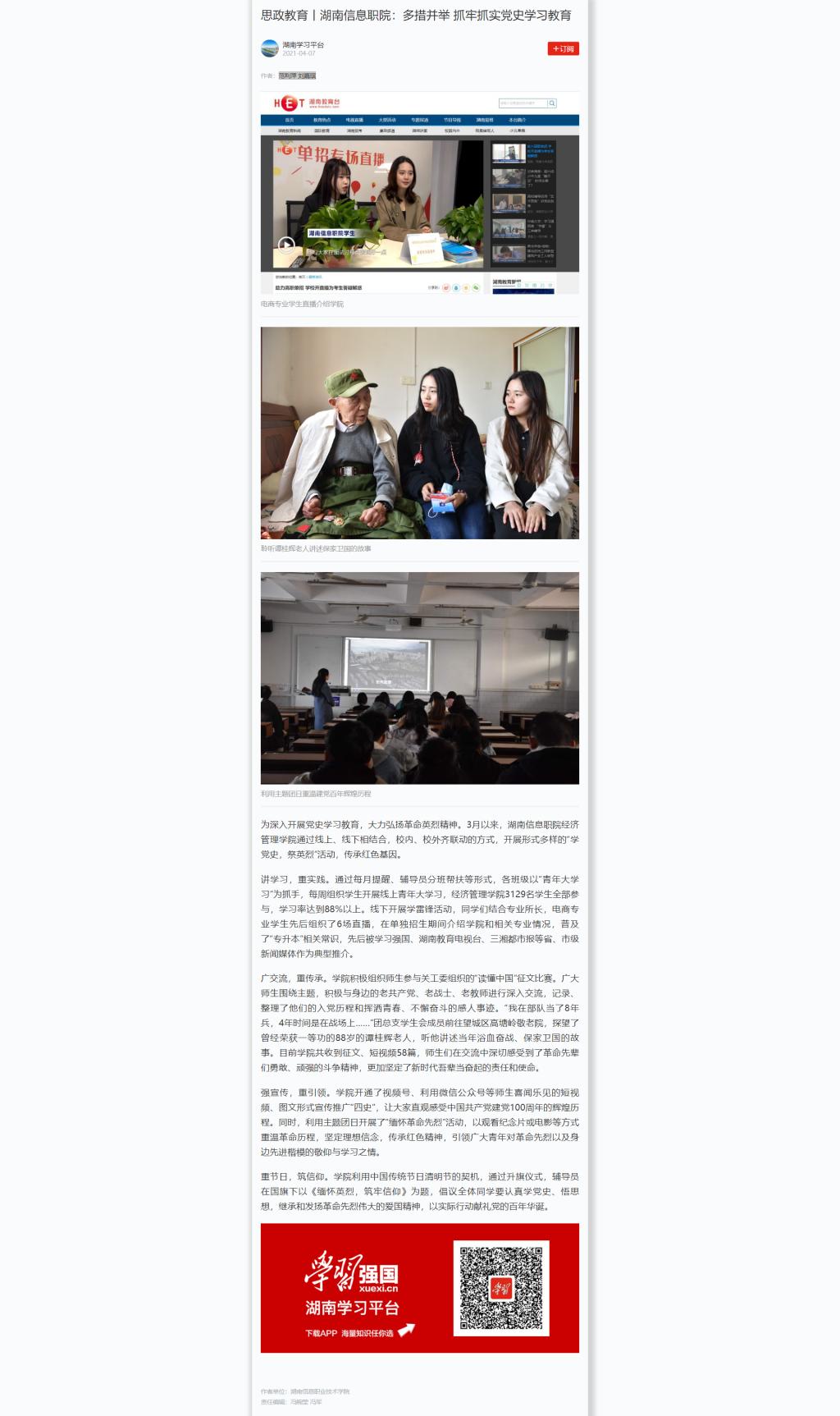 4月7日,学习强国发布《思政教育丨湖南信息职院:多措并举 抓牢抓实党史学习教育》。