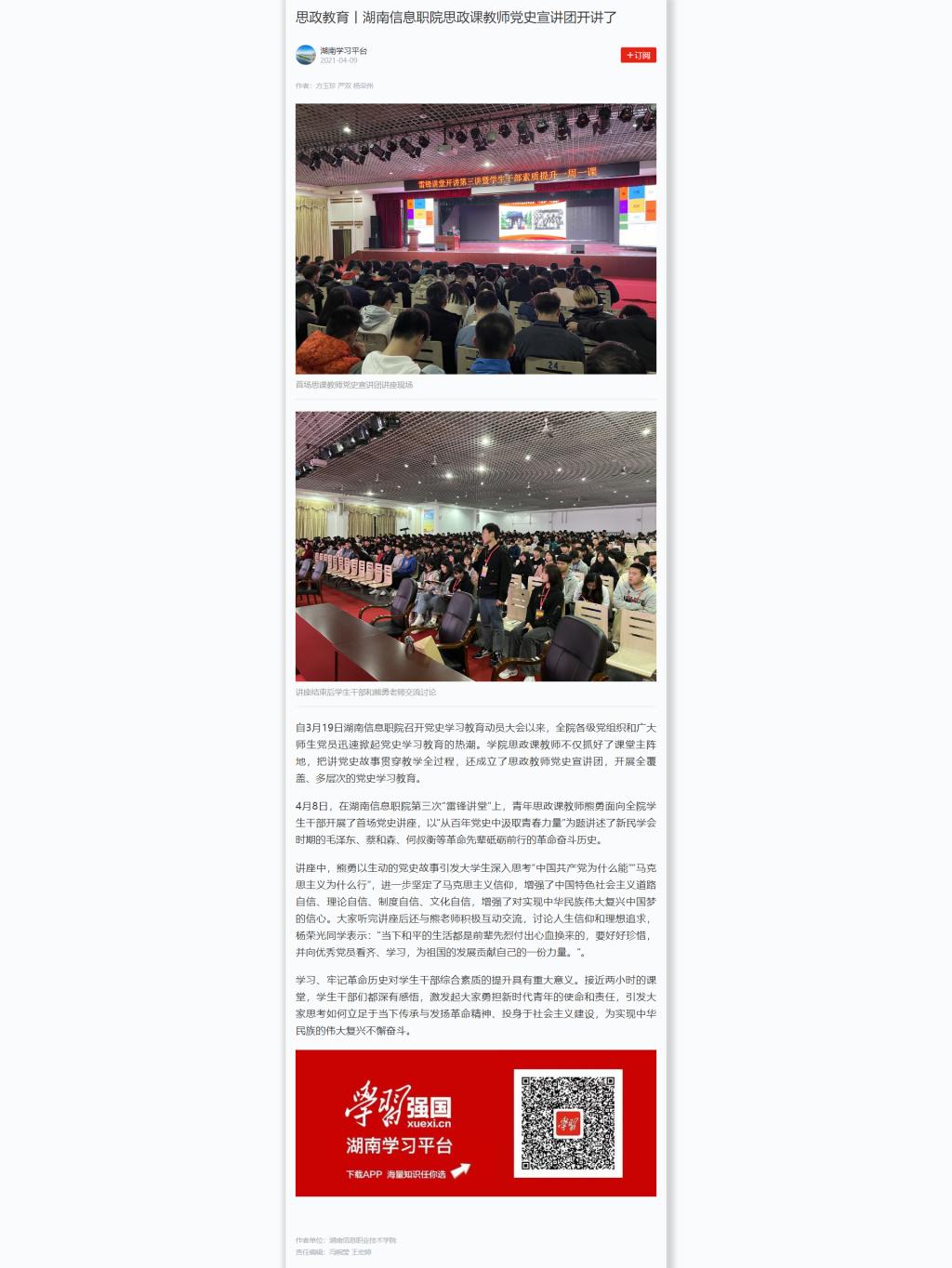 4月9日,学习强国发布《思政教育丨湖南信息职院思政课教师党史宣讲团开讲了》。