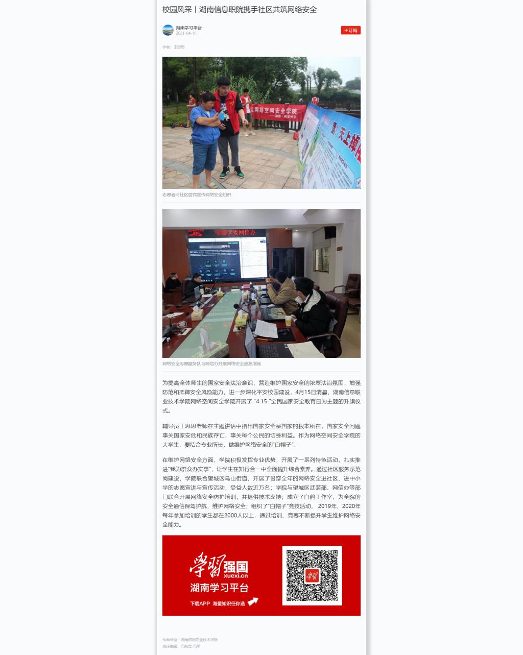 4月16日,学习强国发布《校园风采丨湖南信息职院携手社区共筑网络安全》。