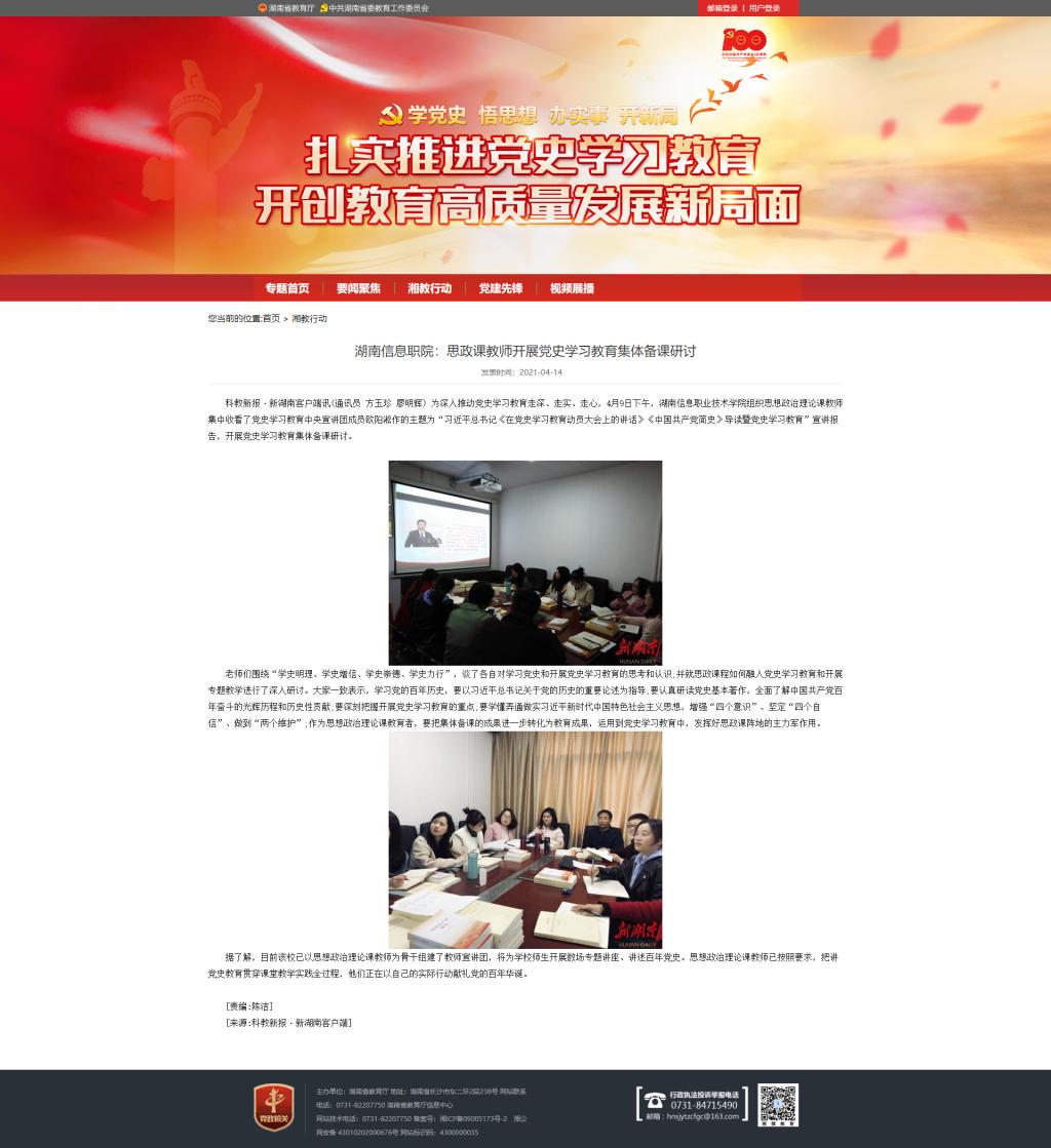 4月14日,湖南教育政务网发布《湖南信息职院:思政课教师开展党史学习教育集体备课研讨》。