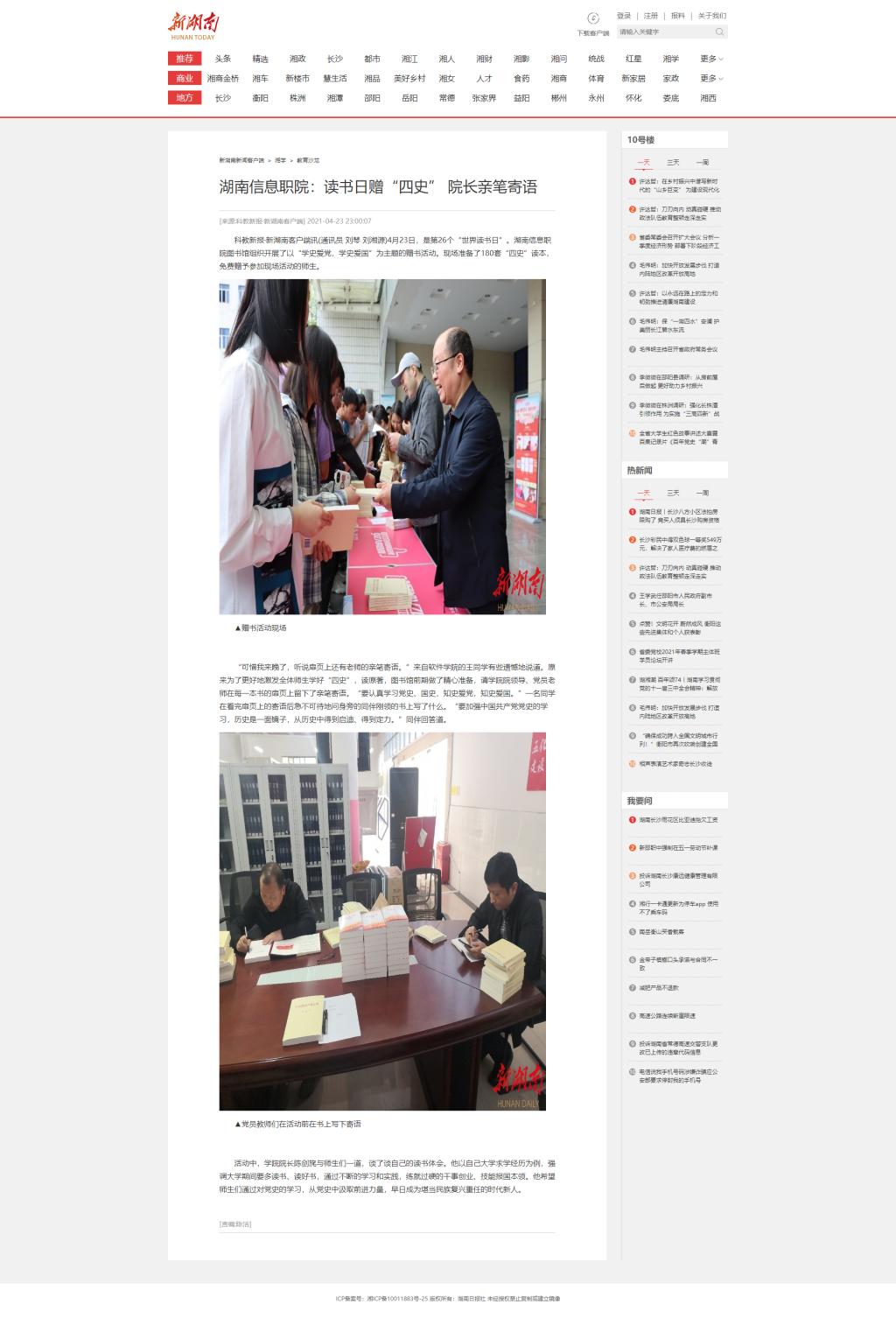 4月23日,新湖南发布《湖南信息职院:读书日赠“四史” 院长亲笔寄语》。
