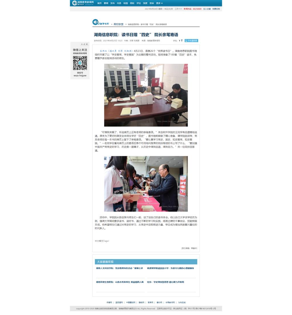 4月25日,湖南教育新闻网发布《湖南信息职院:读书日赠“四史” 院长亲笔寄语》。