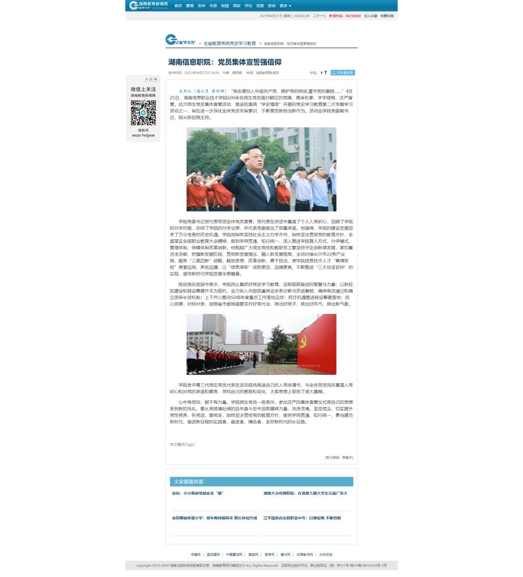 4月27日,湖南教育新闻网发布《湖南信息职院:党员集体宣誓强信仰》。