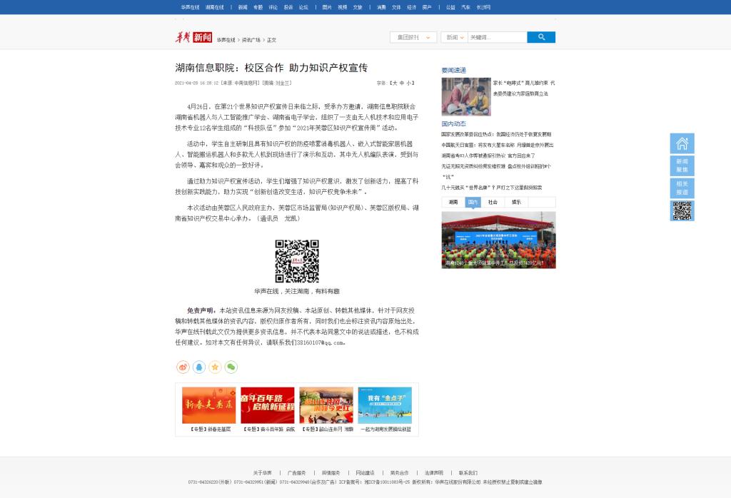 4月28日,华声在线发布《湖南信息职院:校区合作 助力知识产权宣传》。