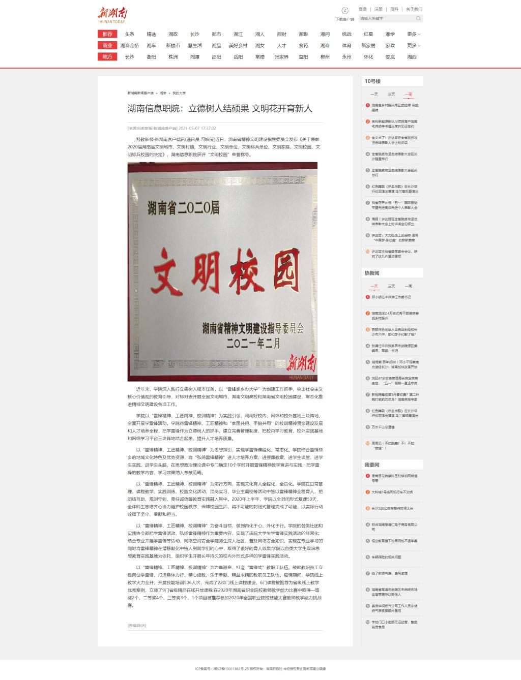 5月7日,新湖南发布《湖南信息职院:立德树人结硕果 文明花开育新人》。