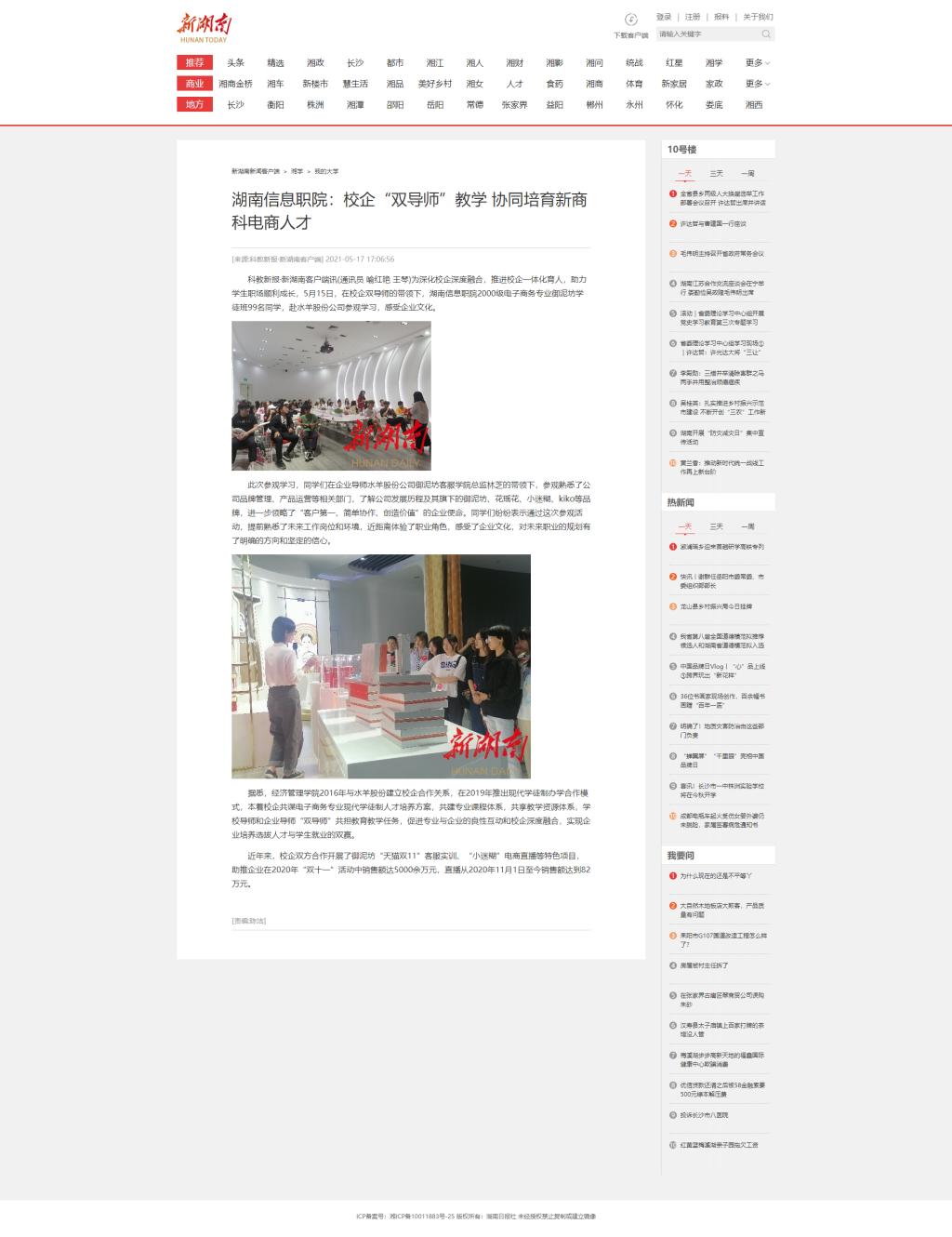 5月17日,新湖南发布《湖南信息职院:校企“双导师”教学 协同培育新商科电商人才》。