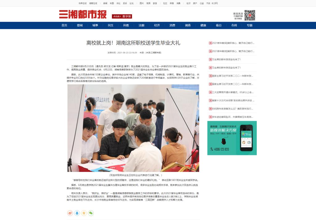 6月23日,三湘都市报发布《离校就上岗!湖南这所职校送学生毕业大礼》。