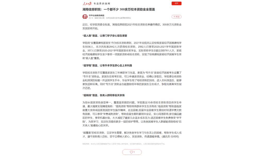 6月19日,人民日报发布《湖南信息职院:一个都不少 300余万校本资助金全覆盖》。