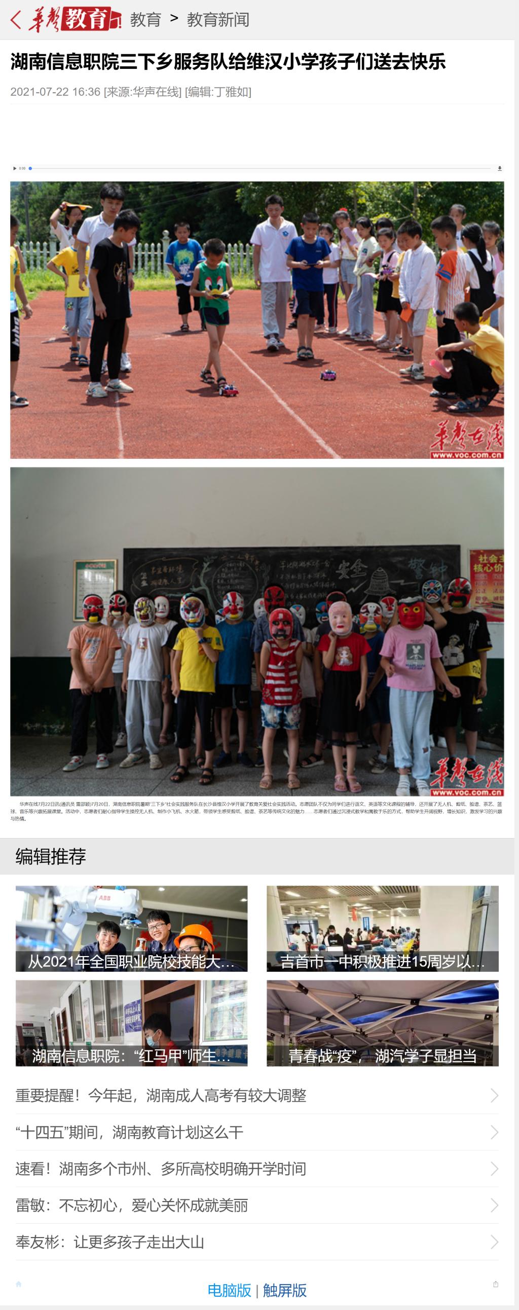 7月22日,华声在线发布《湖南信息职院三下乡服务队给维汉小学孩子们送去快乐》。