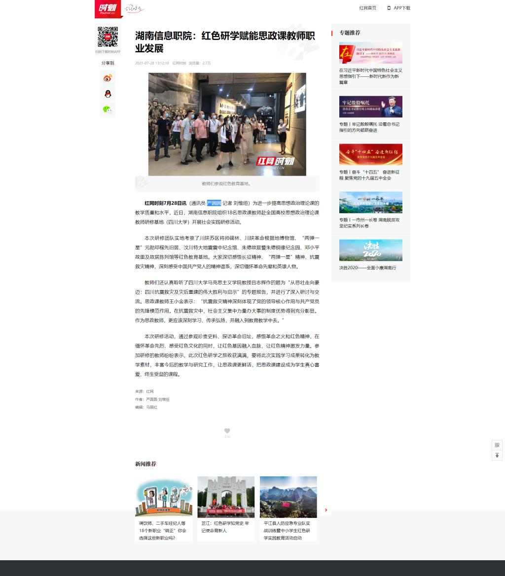 7月28日,红网发布《湖南信息职院:红色研学赋能思政课教师职业发展》。