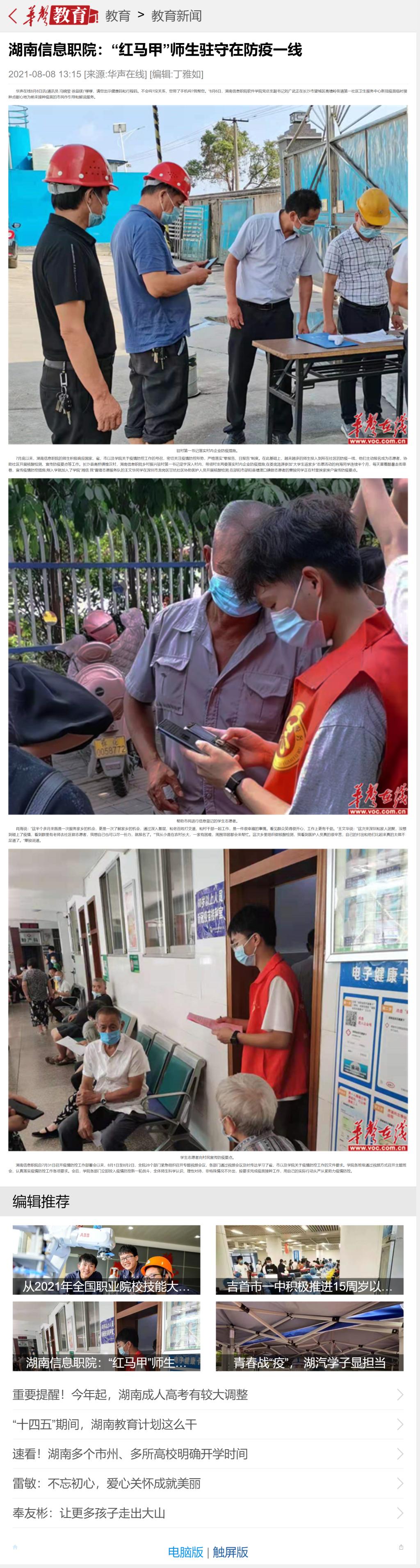 8月8日,华声在线发布《湖南信息职院:“红马甲”师生驻守在防疫一线》。
