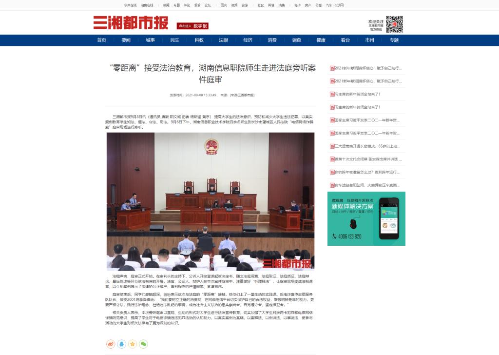 9月8日,三湘都市报发布《“零距离”接受法治教育,湖南信息职院师生走进法庭旁听案件庭审》。