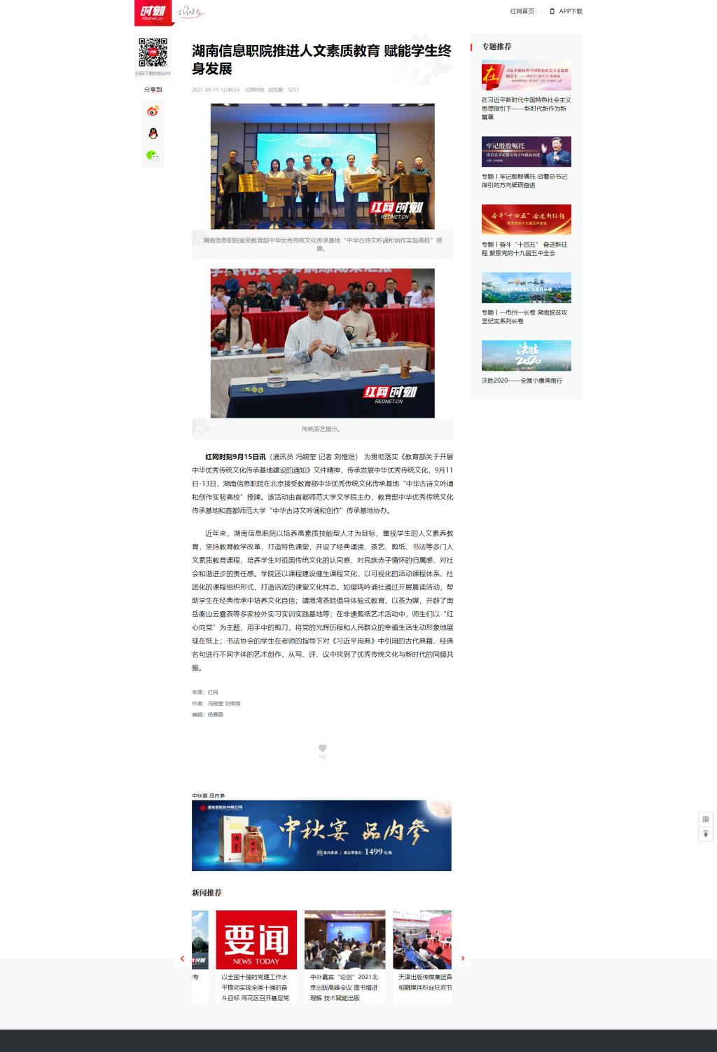 9月15日,红网发布《湖南信息职院推进人文素质教育 赋能学生终身发展》。