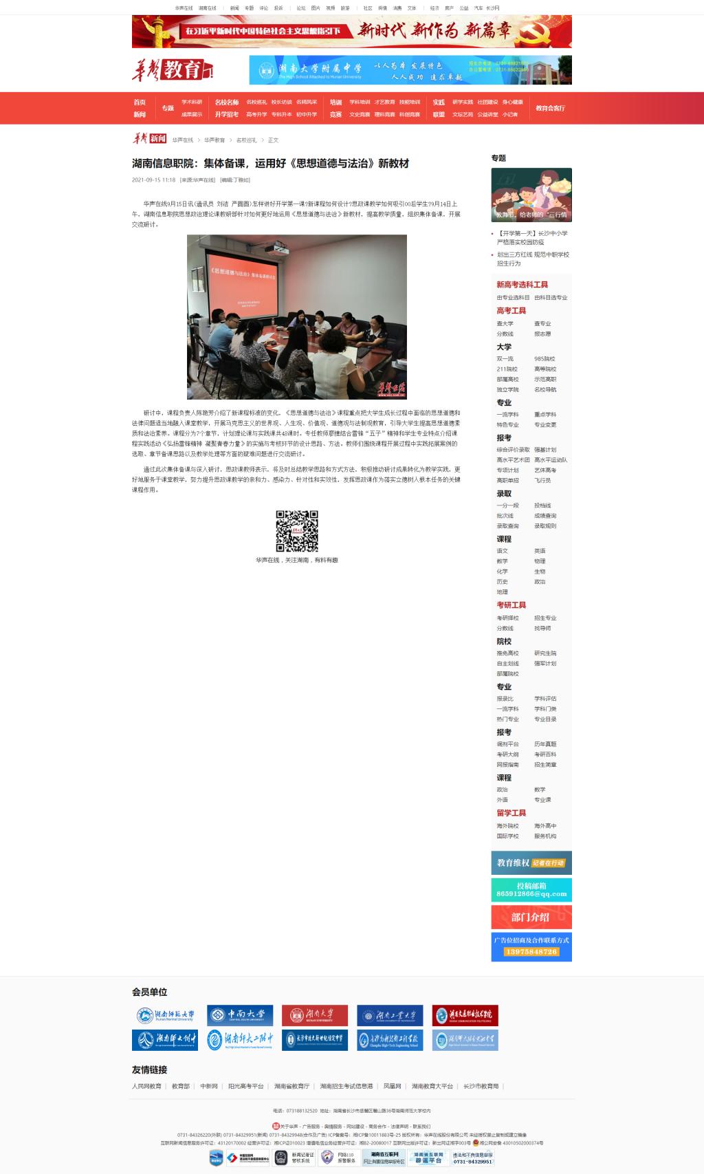 9月15日,华声在线发布《湖南信息职院:集体备课,运用好《思想道德与法治》新教材》。