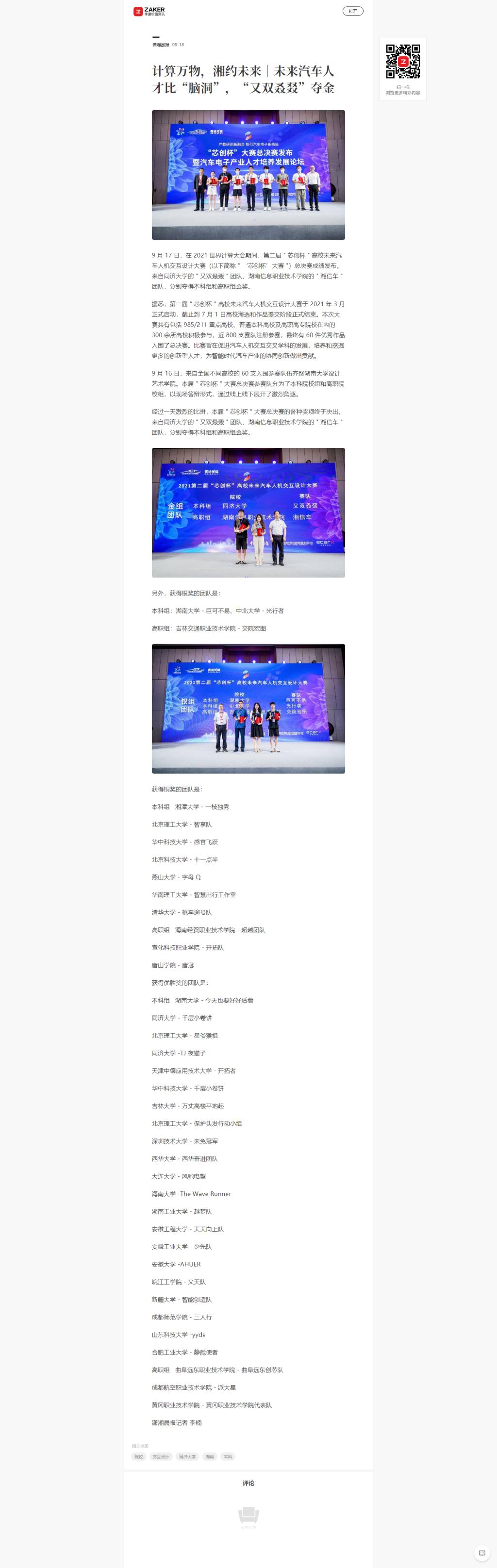 9月18日,潇湘晨报发布《计算万物,湘约未来|未来汽车人才比“脑洞”,“又双叒叕”夺金》。