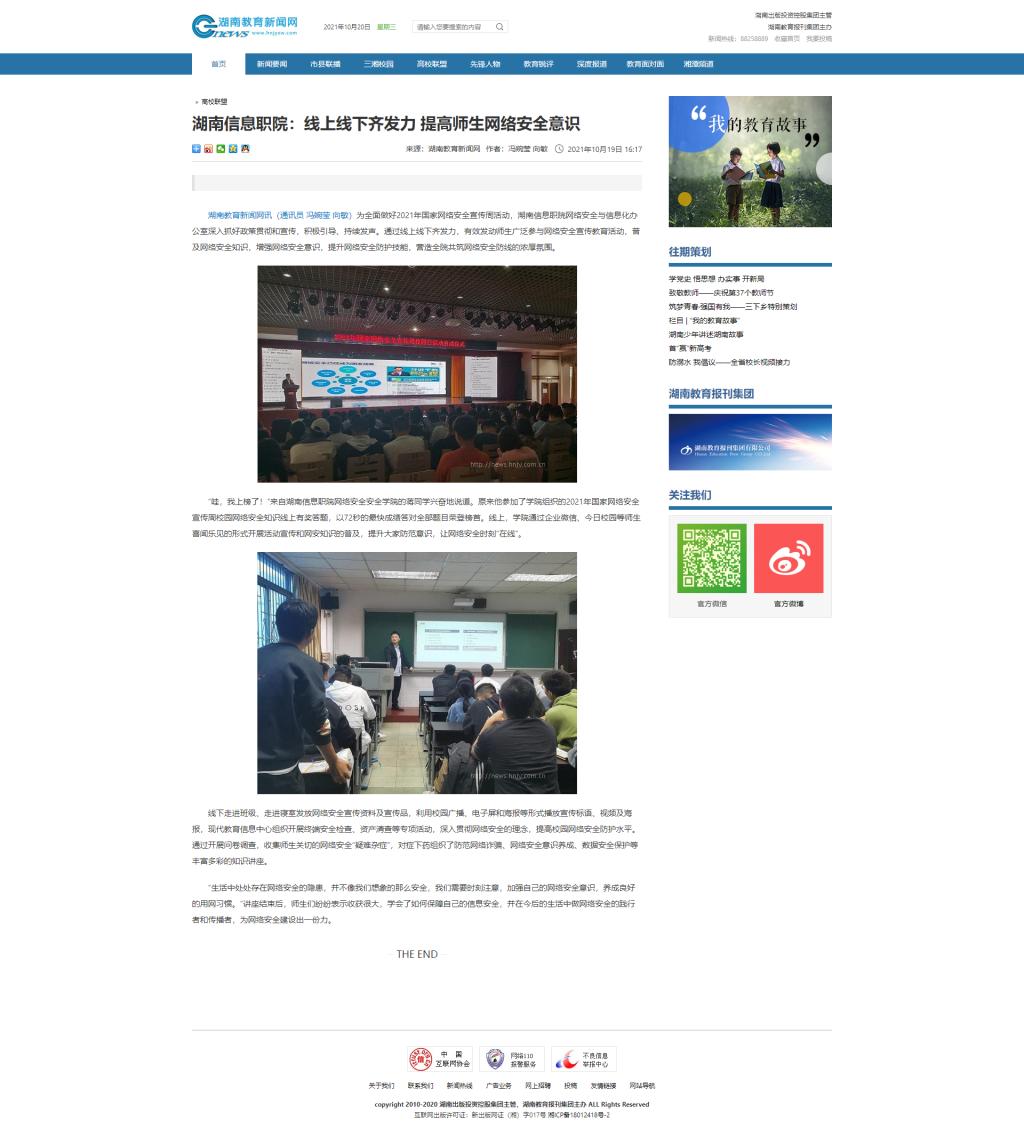 10月19日,湖南教育新闻网发布《湖南信息职院:线上线下齐发力 提高师生网络安全意识》。
