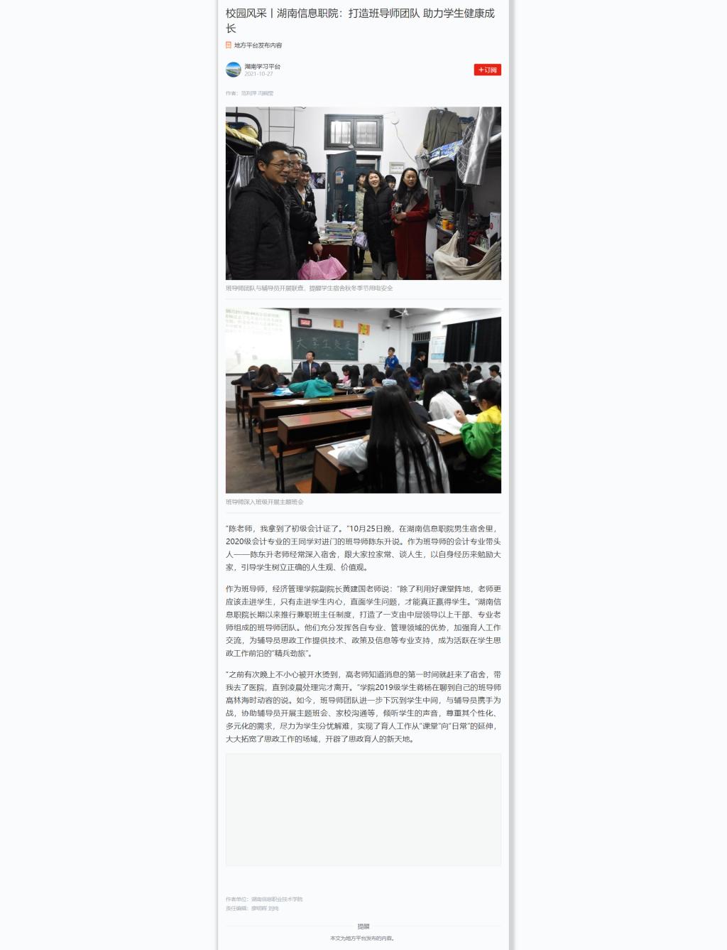 10月27日,学习强国发布《校园风采丨湖南信息职院:打造班导师团队 助力学生健康成长》。