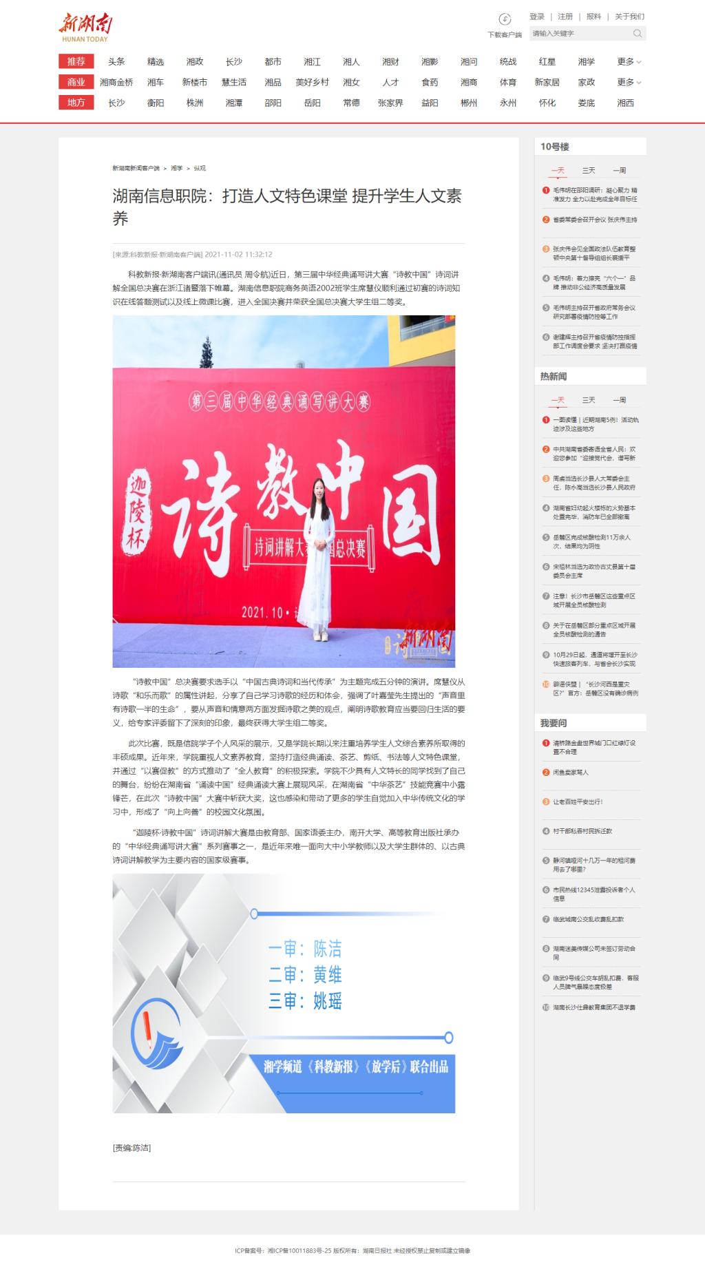 11月2日,新湖南发布《湖南信息职院:打造人文特色课堂 提升学生人文素养》。