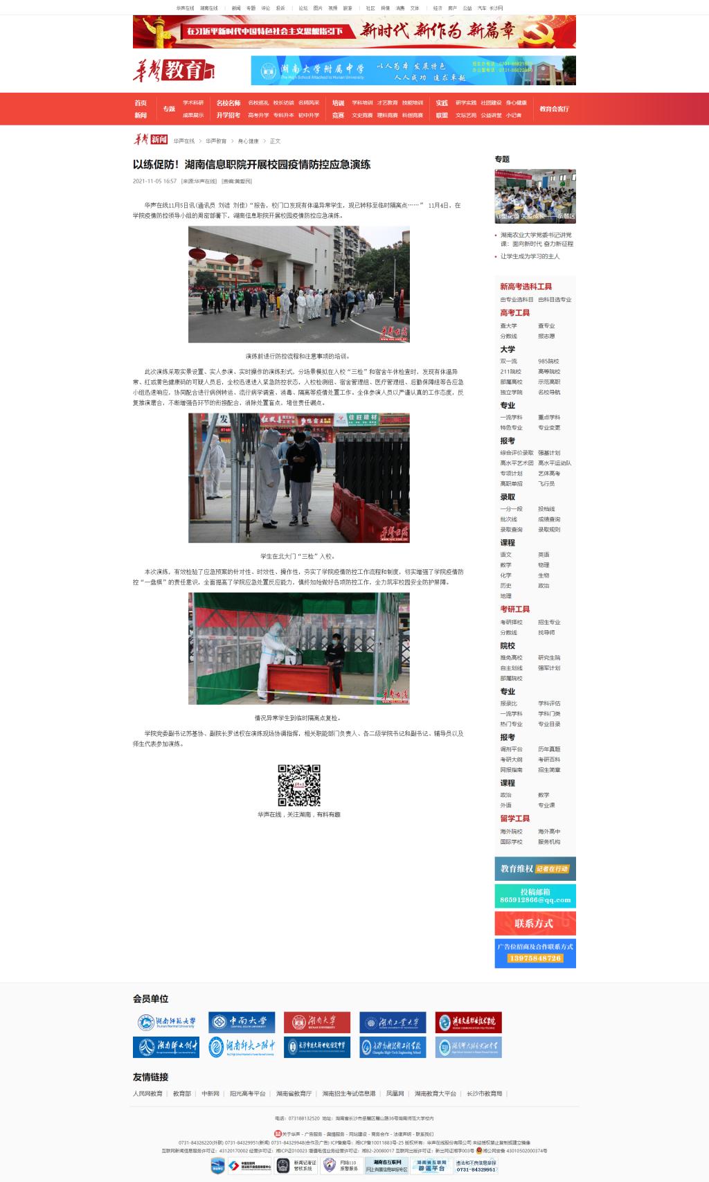 11月5日,华声在线发布《以练促防!湖南信息职院开展校园疫情防控应急演练》。