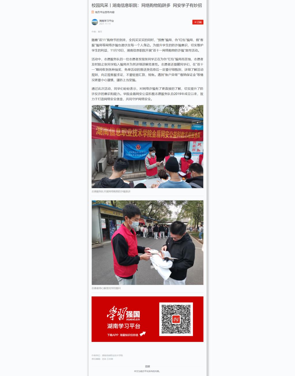 11月11日,学习强国发布《校园风采丨湖南信息职院:网络购物陷阱多 网安学子有妙招》。