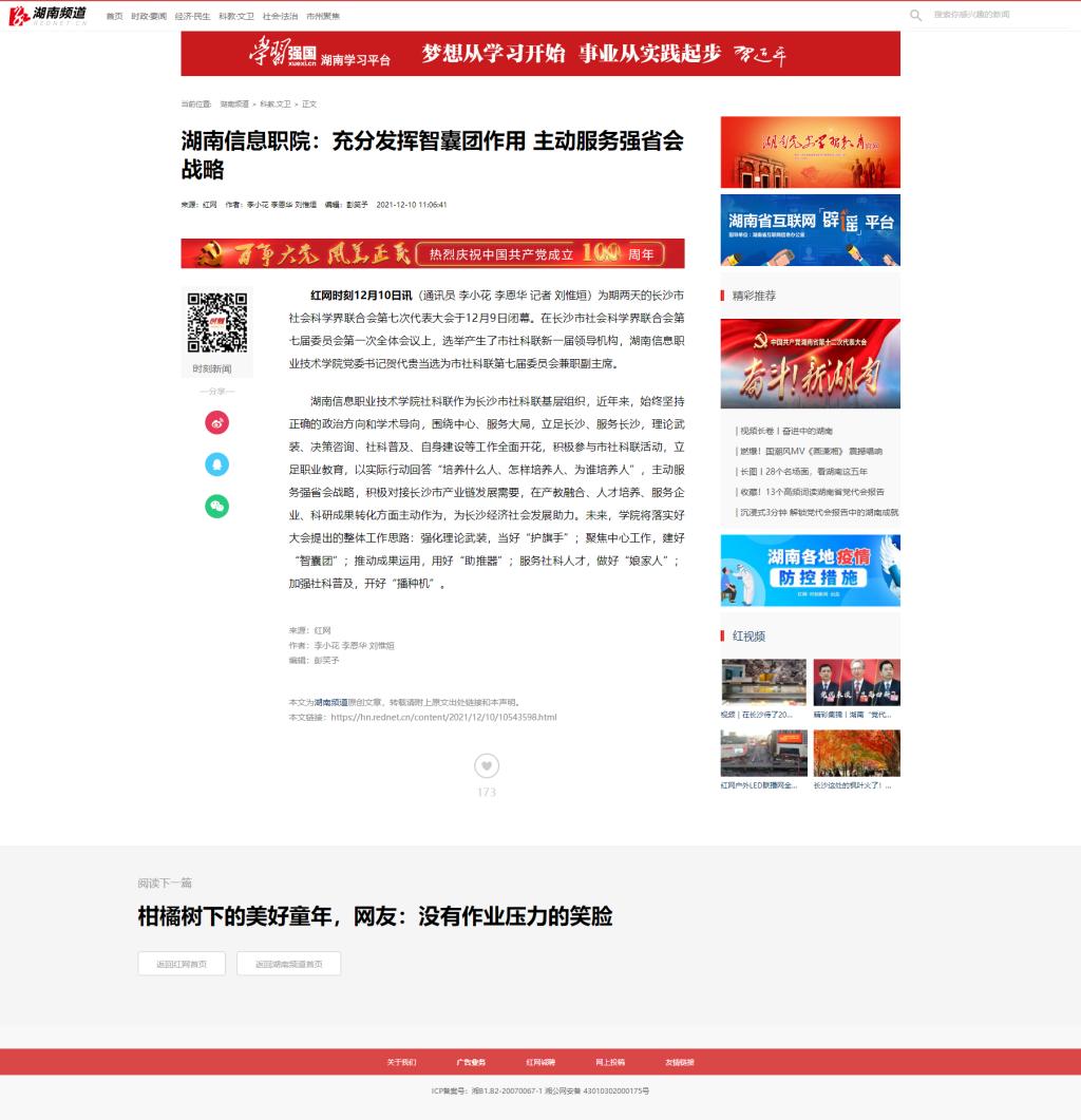 12月10日,红网时刻发布《湖南信息职院:充分发挥智囊团作用 主动服务强省会战略》。