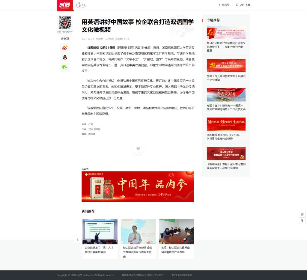 12月24日,红网时刻发布《用英语讲好中国故事校企联合打造双语国学文化微视频》。