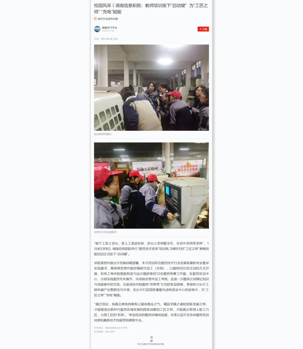 1月6日,学习强国发布《校园风采丨湖南信息职院:教师培训按下“启动键” 为“工匠之师” “充电”赋能》。