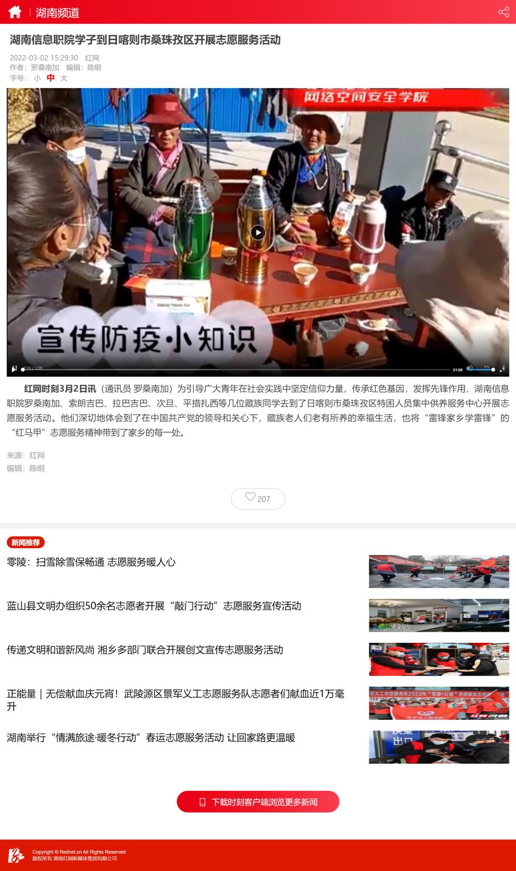 3月2日,红网发布《湖南信息职院学子到日喀则市桑珠孜区开展志愿服务活动》