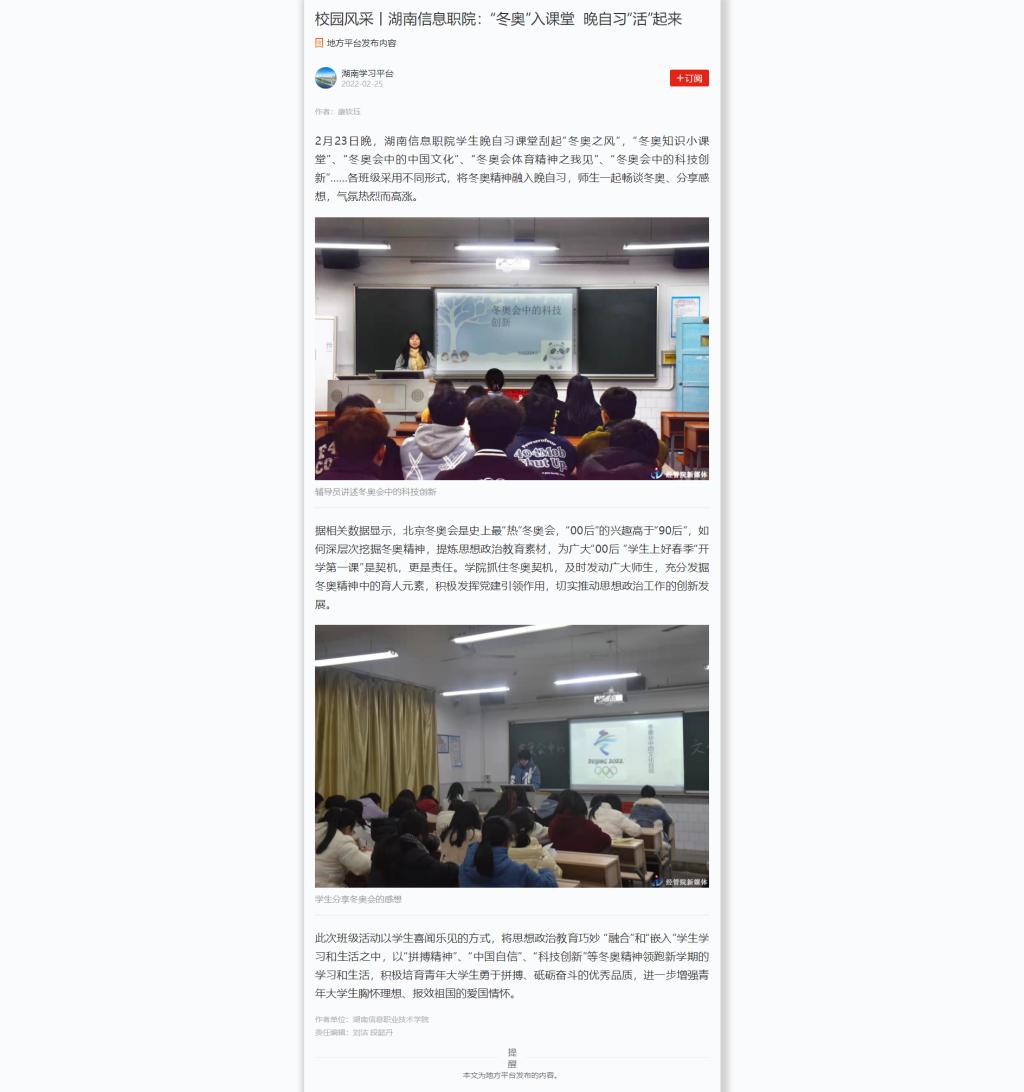 2月25日,学习强国发布《校园风采丨湖南信息职院:“冬奥”入课堂 晚自习“活”起来》