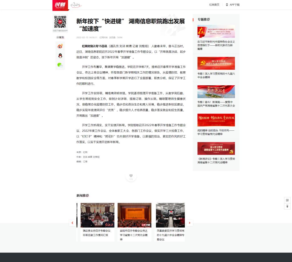 2月15日,红网时刻发布《新年按下“快进键” 湖南信息职院跑出发展“加速度”》