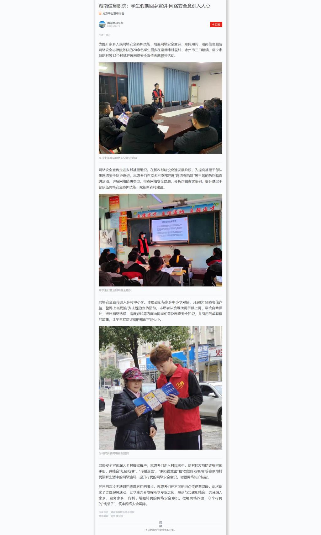 2月15日,学习强国发布《湖南信息职院:学生假期回乡宣讲 网络安全意识入人心》