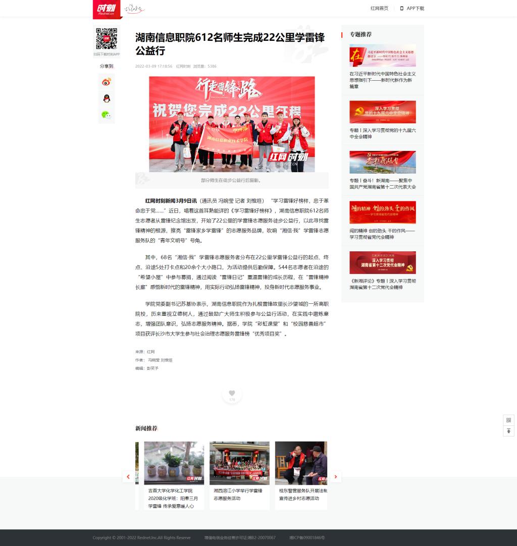 3月9日,红网时刻发布《湖南信息职院612名师生完成22公里学雷锋公益行》