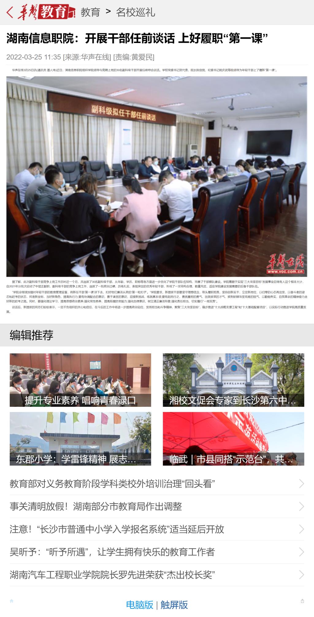 3月25日,华声在线发布《湖南信息职院:开展干部任前谈话 上好履职“第一课”》