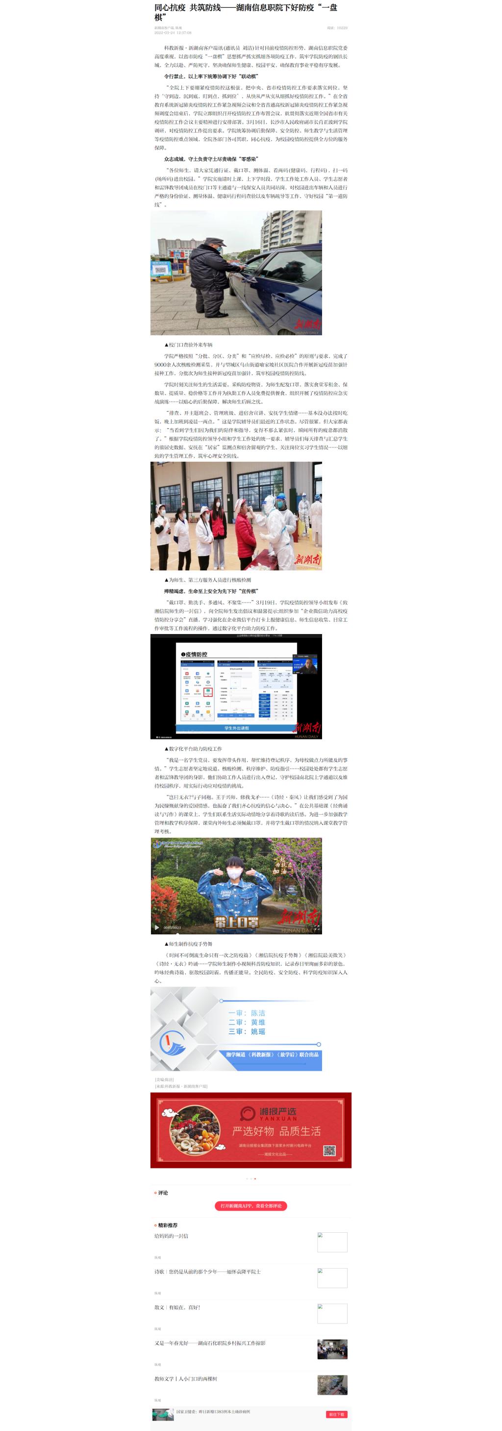 3月24日,新湖南发布《同心抗疫 共筑防线——湖南信息职院下好防疫“一盘棋” 》