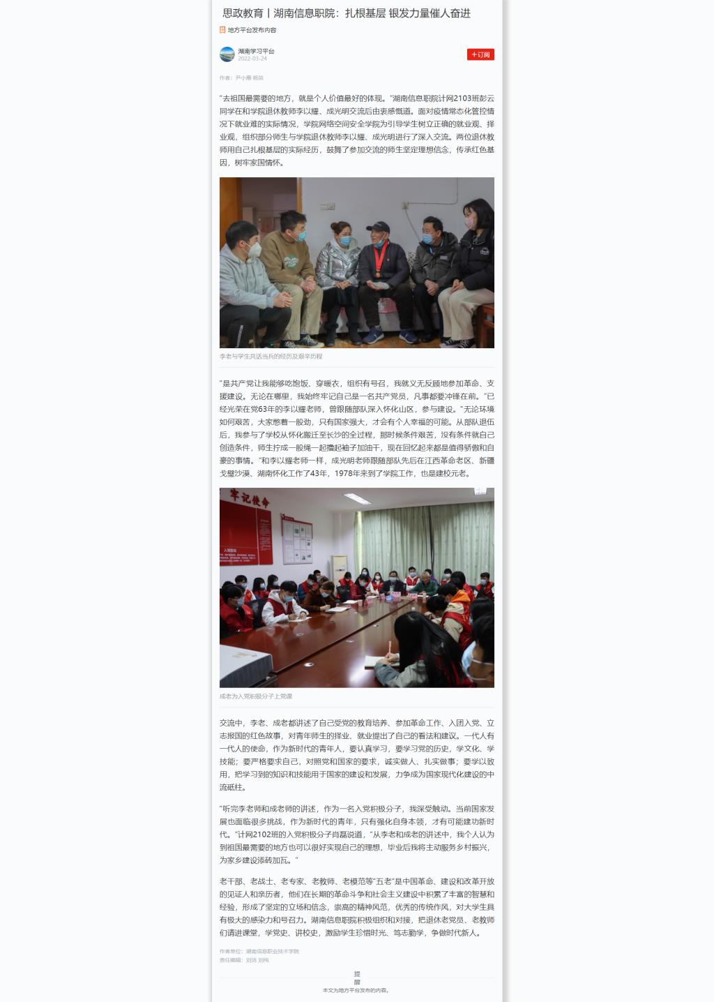 3月24日,学习强国发布《思政教育丨湖南信息职院:扎根基层 银发力量催人奋进》