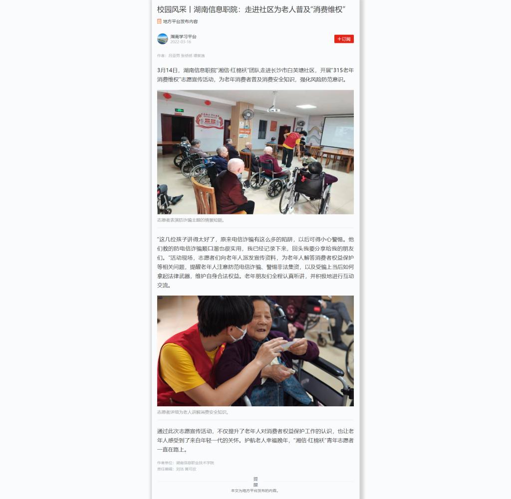3月16日,学习强国发布《校园风采丨湖南信息职院:走进社区为老人普及“消费维权”》
