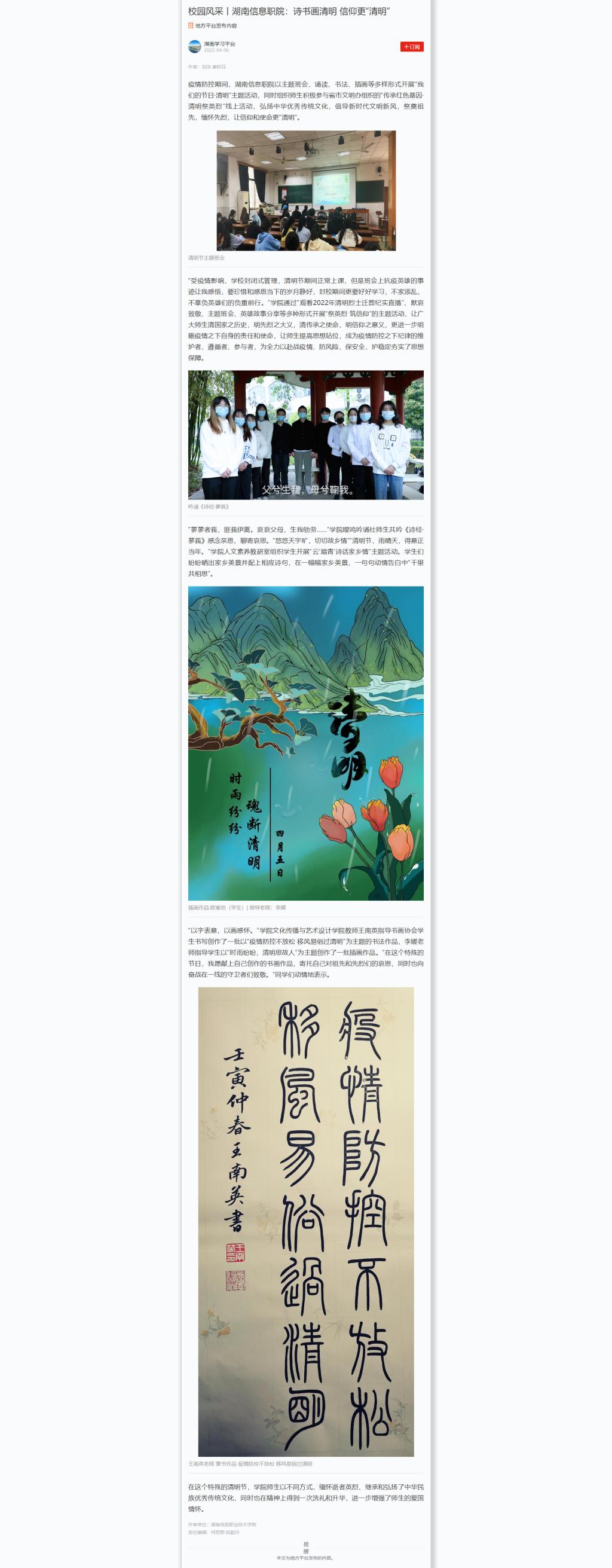 4月6日,学习强国发布《校园风采丨湖南信息职院:诗书画清明 信仰更“清明”》