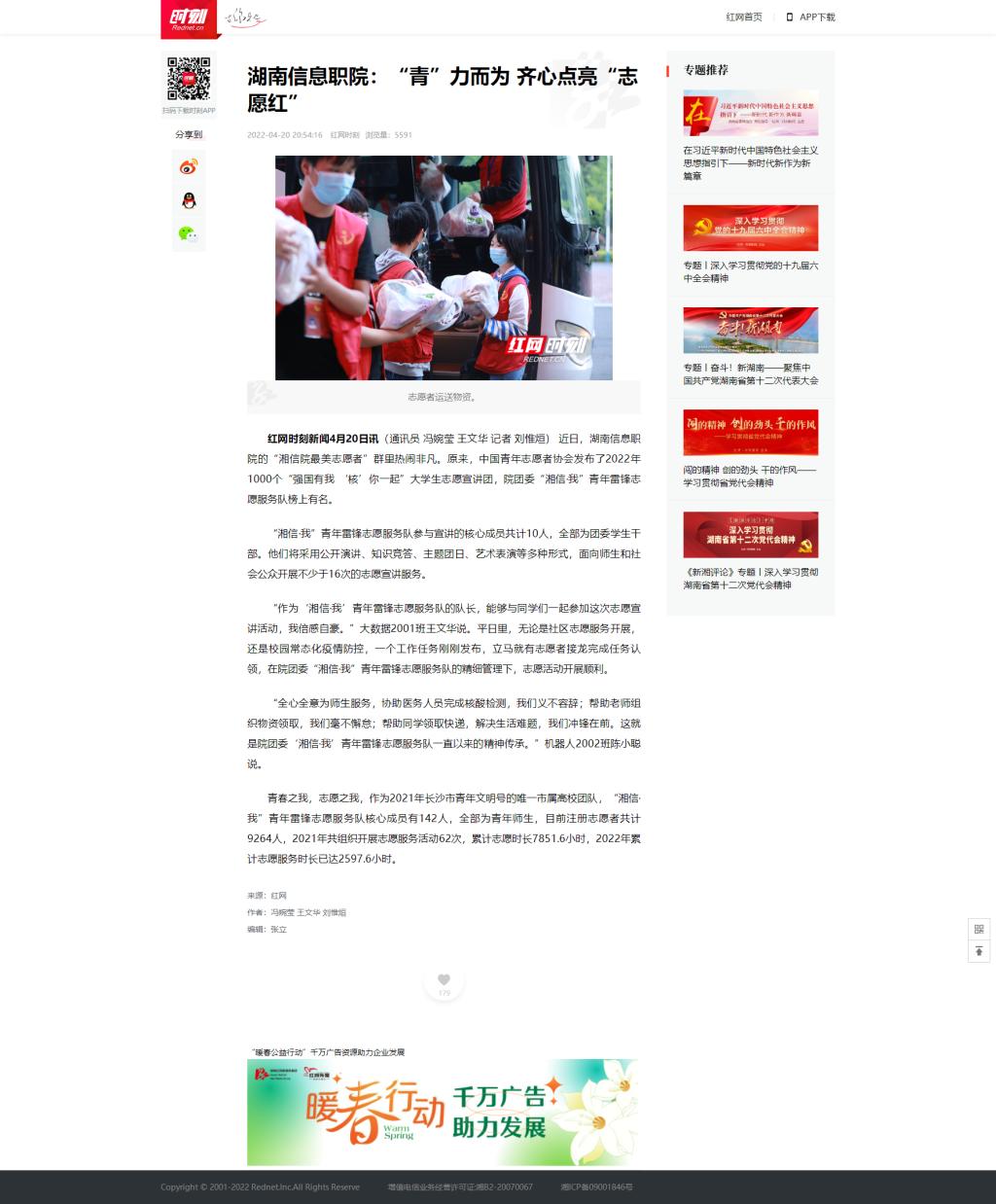 4月20日,红网时刻发布《湖南信息职院:“青”力而为 齐心点亮“志愿红”》