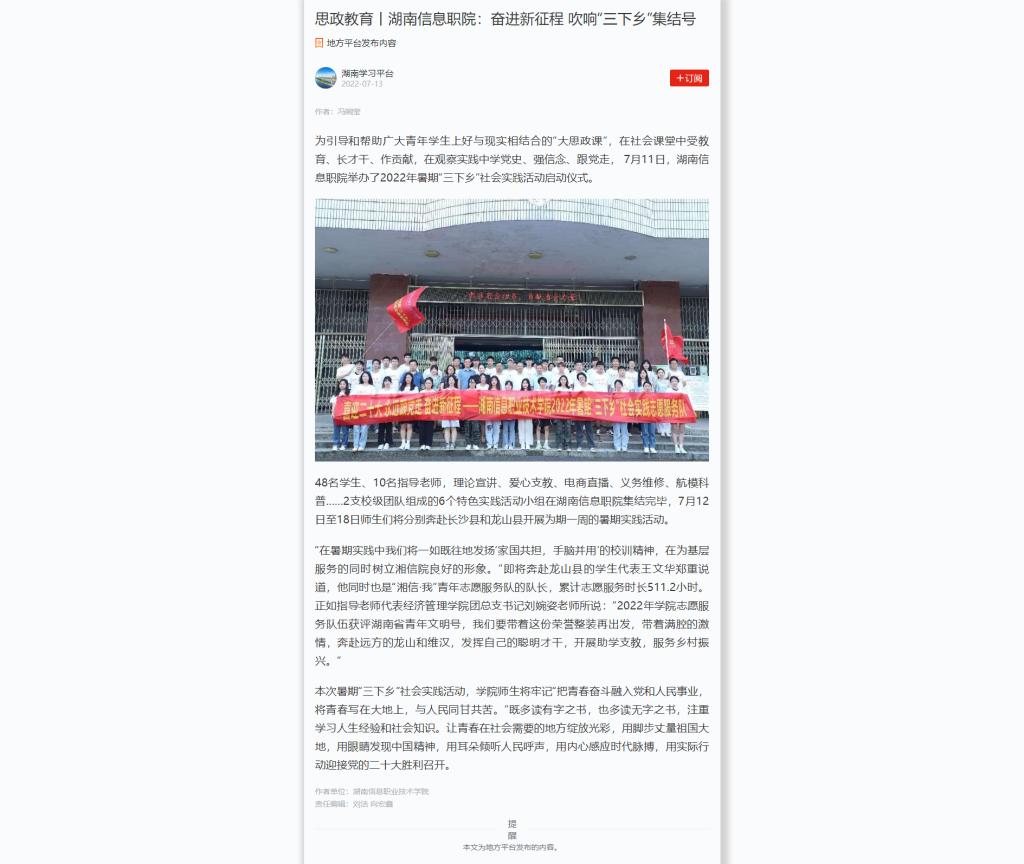 7月13日,学习强国发布《思政教育丨湖南信息职院:奋进新征程 吹响“三下乡”集结号》