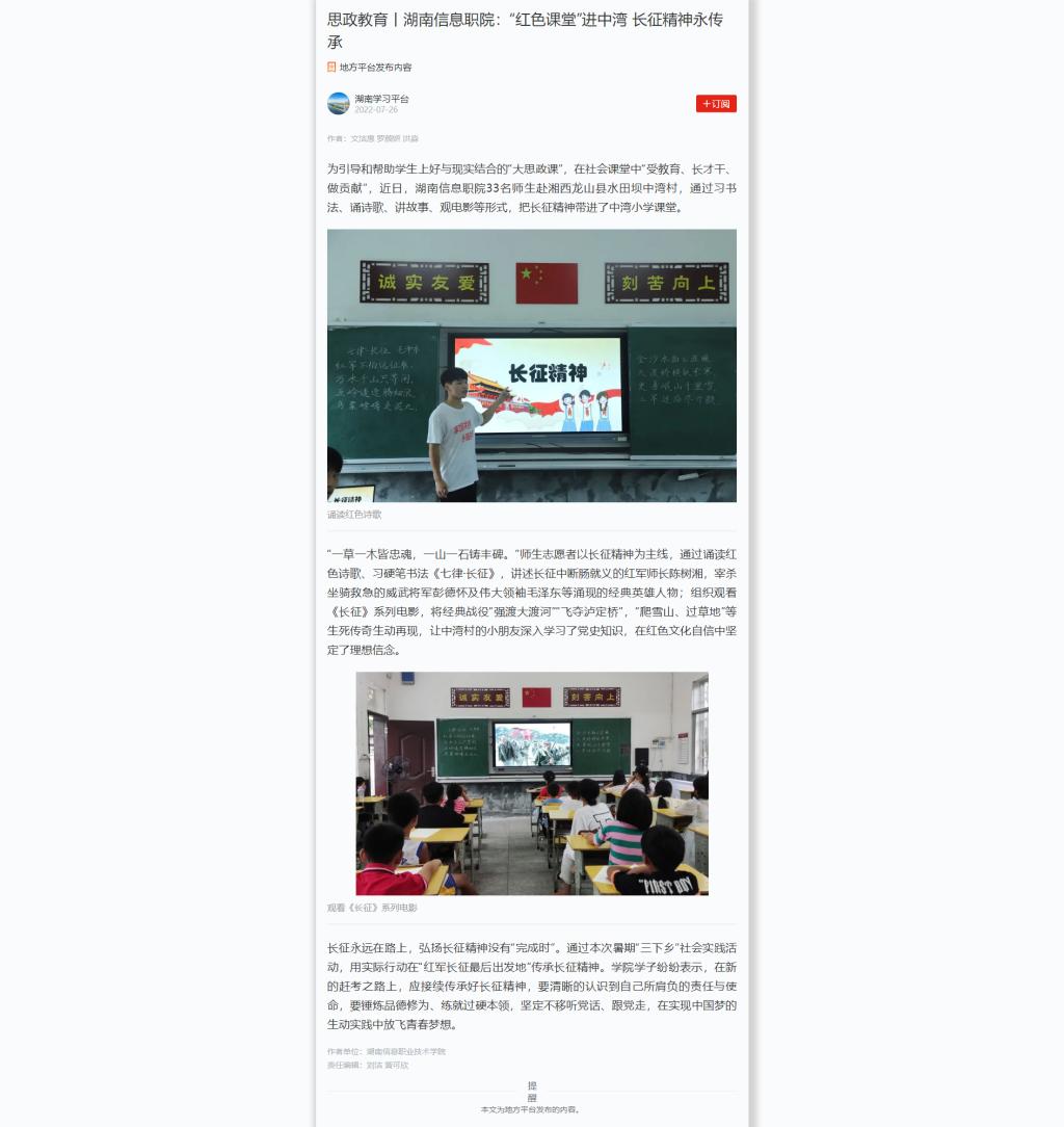 7月26日,学习强国发布《思政教育丨湖南信息职院:“红色课堂”进中湾 长征精神永传承》