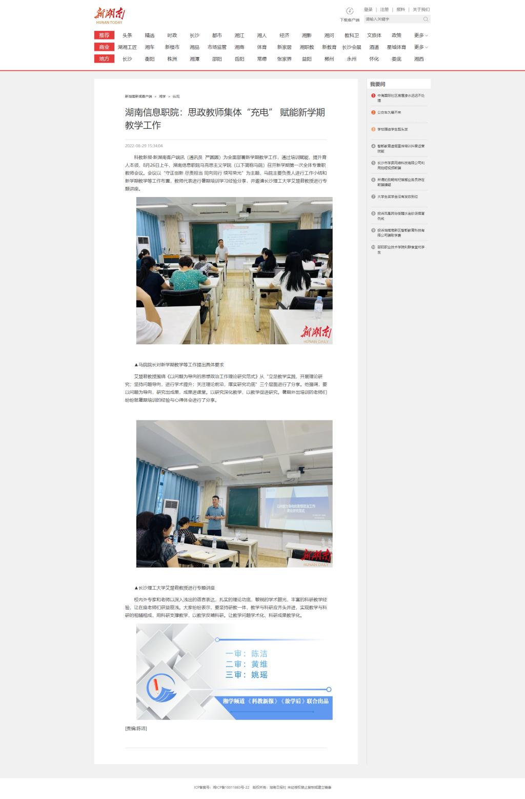 8月29日,新湖南发布《湖南信息职院:思政教师集体“充电” 赋能新学期教学工作》