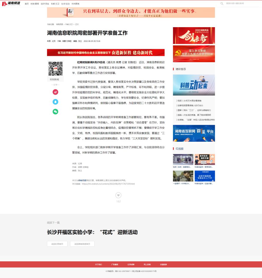 8月29日,红网时刻发布《湖南信息职院周密部署开学准备工作》