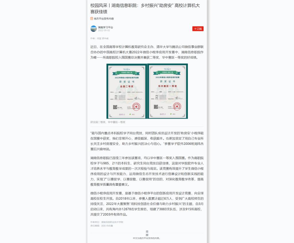 9月2日,学习强国发布《校园风采丨湖南信息职院:乡村振兴“助房安” 高校计算机大赛获佳绩》