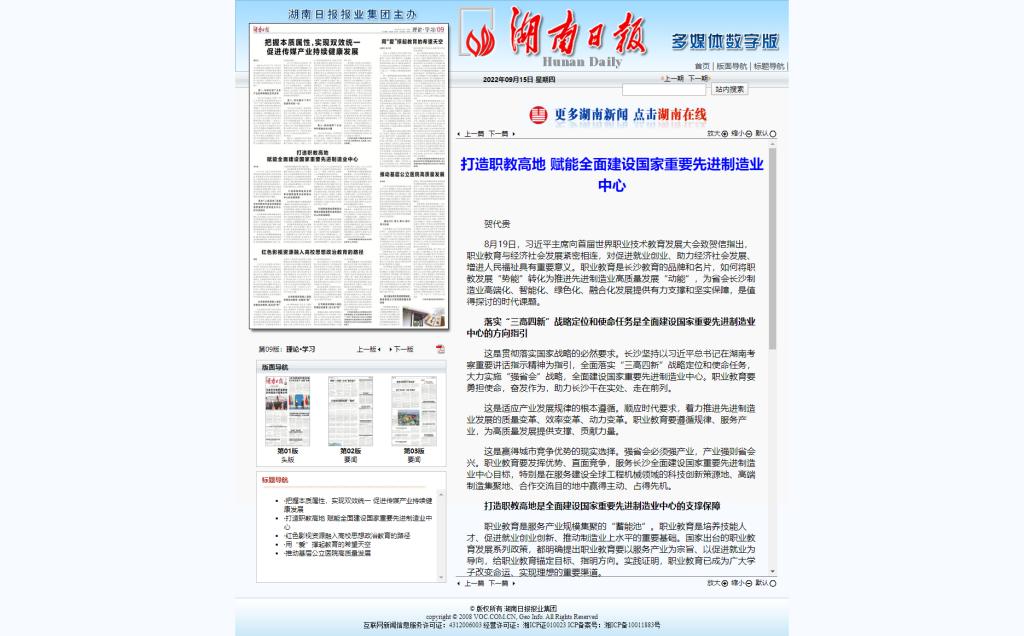 9月15日,湖南日报发布《打造职教高地 赋能全面建设国家重要先进制造业中心》