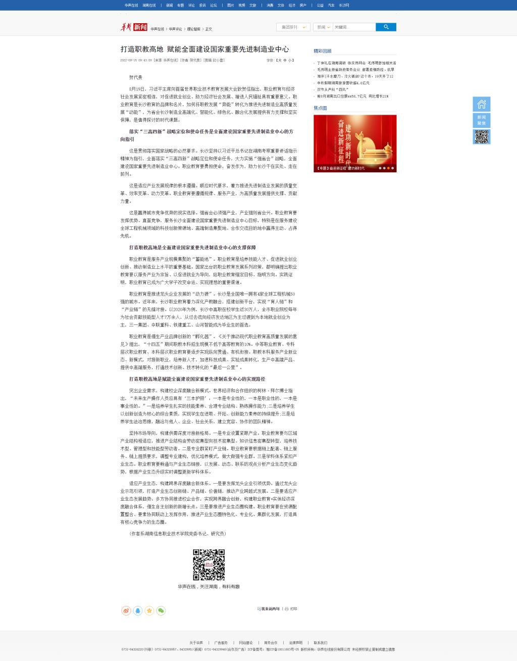 9月15日,华声在线发布《打造职教高地 赋能全面建设国家重要先进制造业中心》